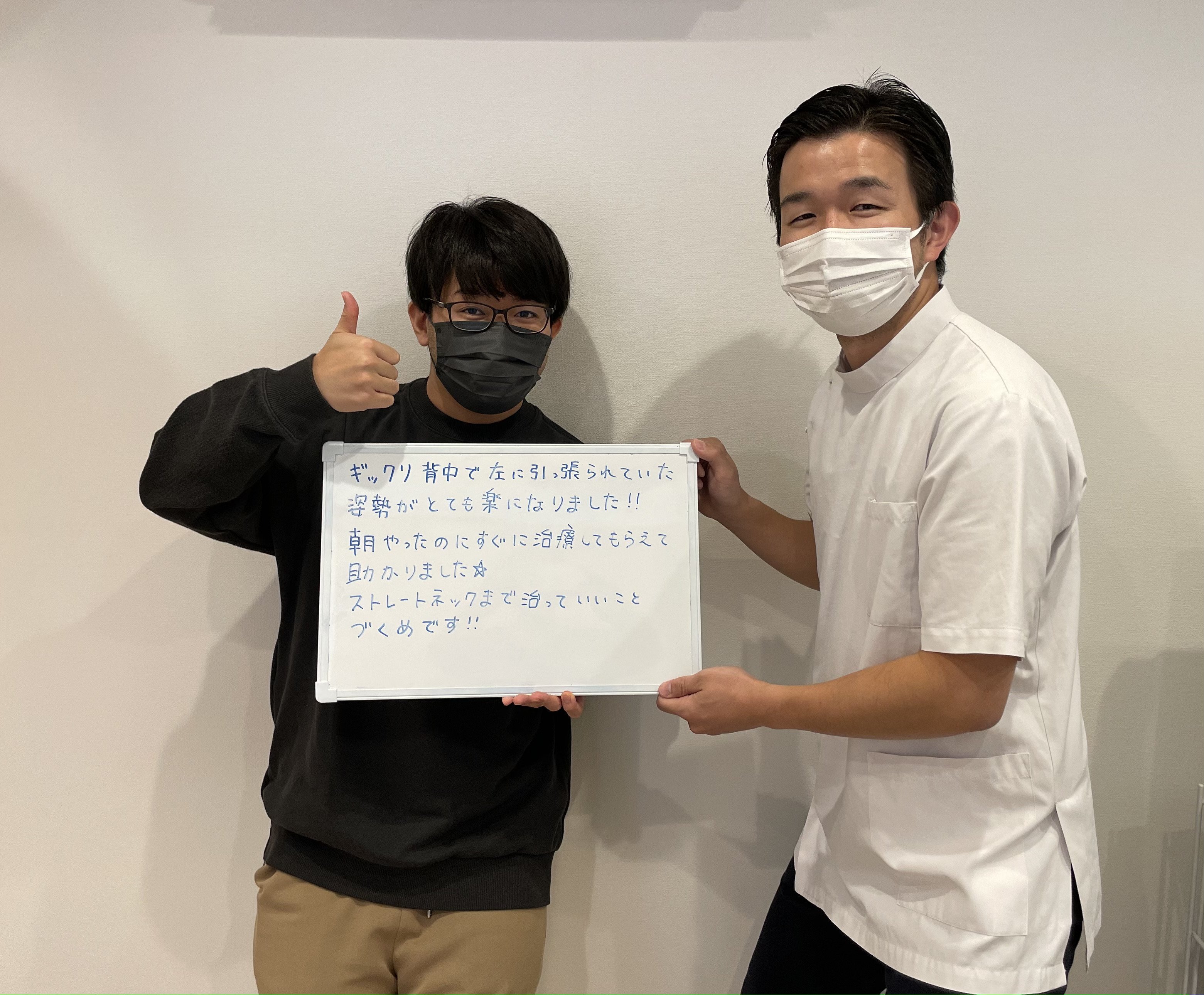 高校生の頃に、ヘルニアの診断を受けてから、騙し騙しスポーツを続けてきました。 様々な施術を受けてきましたが、根本的な改善は見られなかったのですが、今回の施術を体験し、一気に身体が軽くなり、姿勢が良くなった気がします。 姿勢チェックが肩が壁に付かなかったのですが、背中が真っ直ぐになり、動きがスムーズになりました。伴い、腰痛も改善されました。 今後の自身の活動に幅が生まれそうで本当に嬉しいです。ありがとうございました。