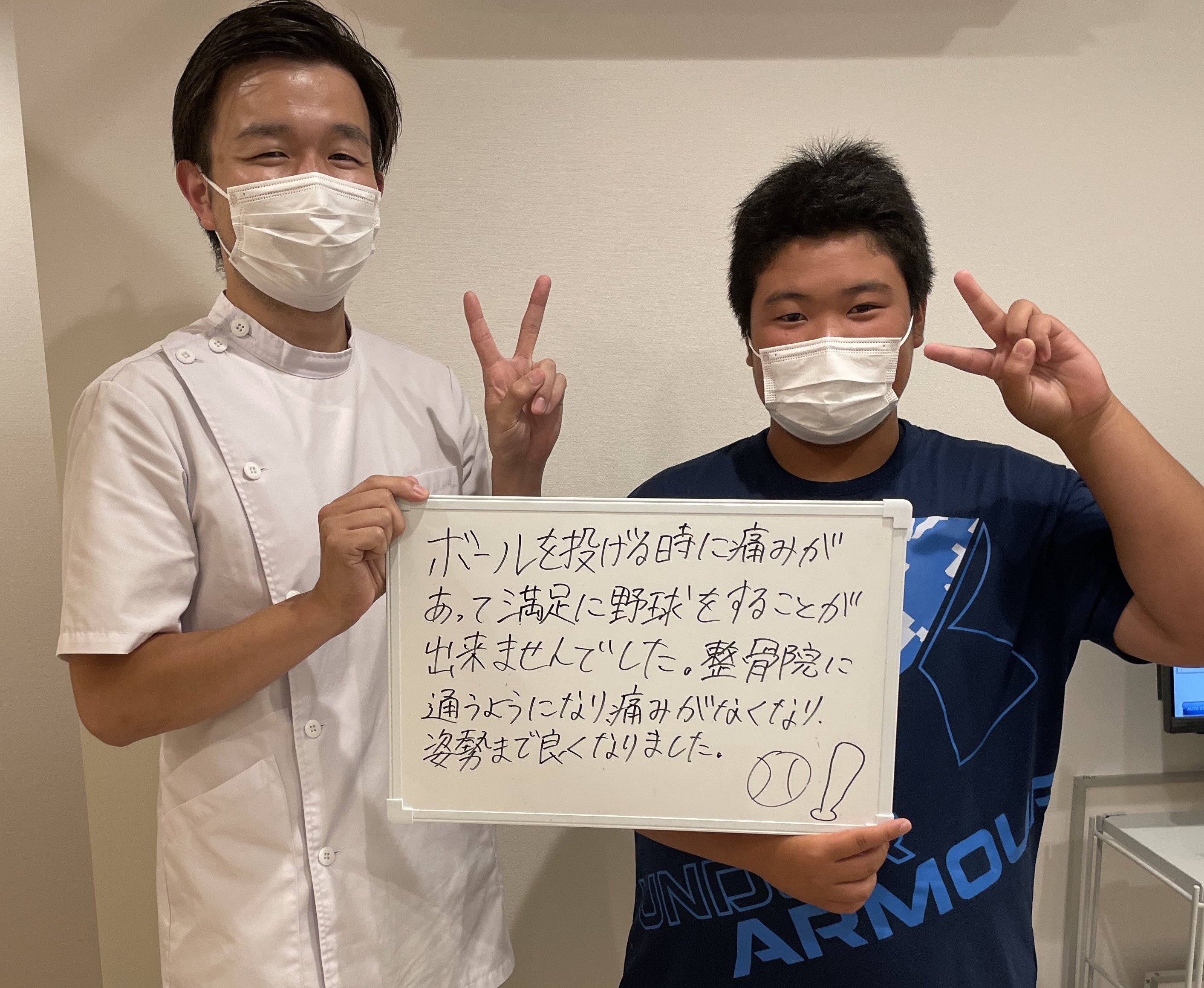 小学生から続けている野球が100%の力でできなくなっていました。 ボールを投げる際に肩・肘が痛くなり、大好きだった野球をやめようと思う時もありました。 先生も野球をやっていたことから、通院するようになり、今では肩・肘の痛みがなく、大好きな野球を100%の力でできるようになりました。 これから高校でも続けていきたいので、治療を続けていきたいと思います。