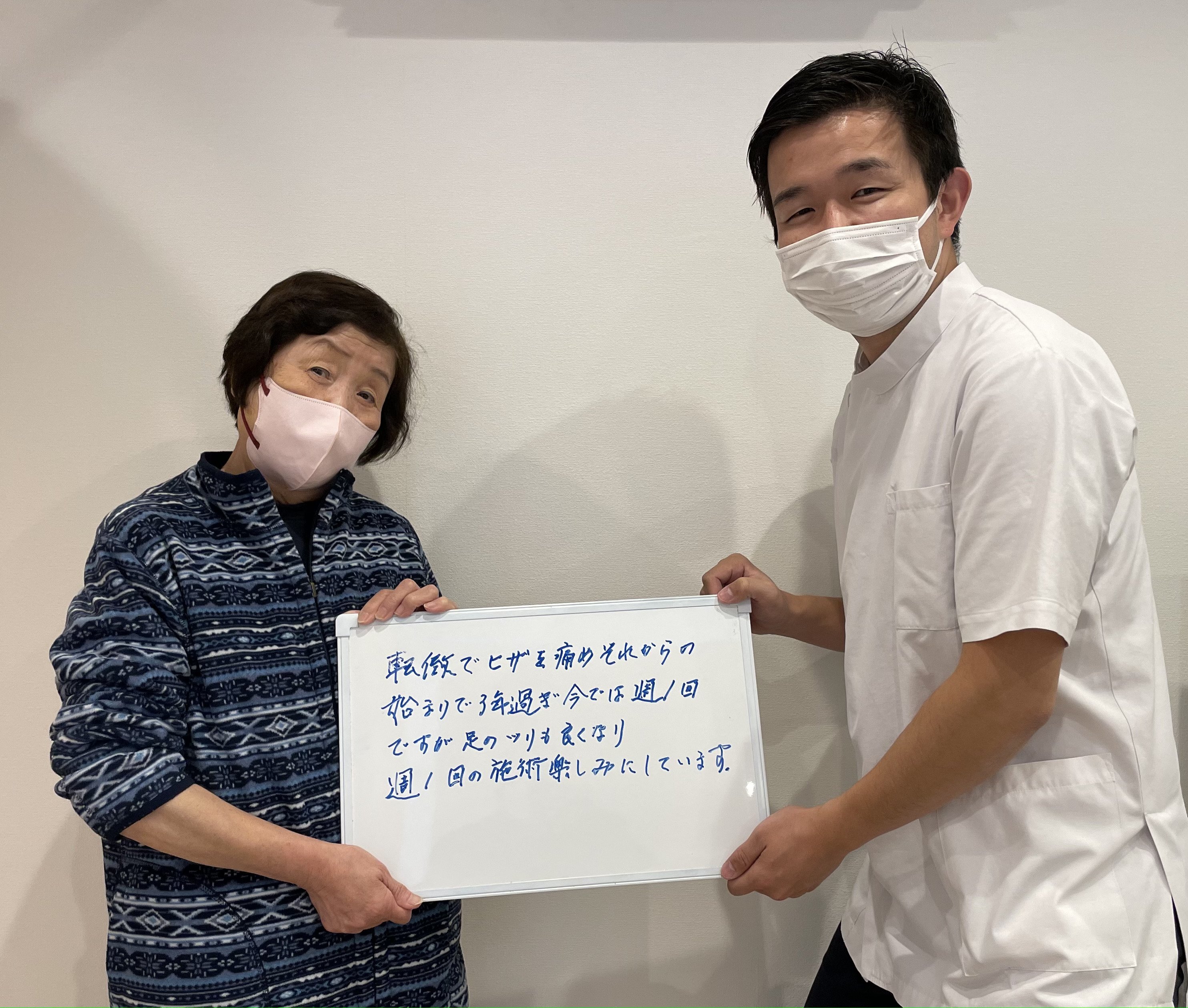 転倒で膝を痛めそれが始まりで通院するようになりました。 今では膝の痛み・夜中足が攣ることもなくなり、週に1回の施術を楽しみにしています。