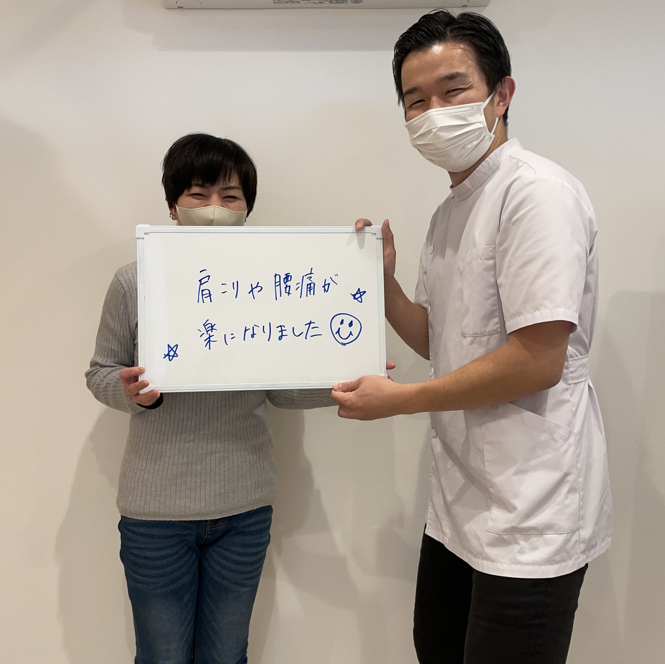 肩こり・腰痛があり、就寝時に特に違和感・痛みが強くなることで寝付くまでに一時間ほどかかる生活を長年送っていました。 先日結婚をしたこともあり、これから健康に過ごしたと思い通院するようになりました。
