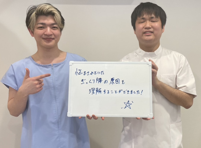「ギックリ腰の原因が明確になりました‼︎」 数年前に靴を履こうとして屈んだ際にギックリ腰に初めてなり、それからギックリ腰を繰り返すようになり根本から改善したい!という思いで受診するようになりました。 別の整骨院には3件ほど通院した経験はありましたが、根本的な改善に対して期待できませんでした。しかしこちらの整骨院では根本的に体を変えるために姿勢を整える!という事をカウンセリング時に言って頂けた事で繰り返し起こるギックリ腰の原因が明確にわかりました。 様々な検査を受ける事で自分の現状を知る事ができ、施術中も痛みがなく心地よい施術でした! 先生から「最近姿勢が悪くなったわけではないので、治療にも時間が掛かりますが一緒に健康な体になりましょう!」と言って頂き、改めて健康に対して目を向けようという気持ちになれました! (I.E様 20代男性 杉並区在住) ※効果には個人差があります |