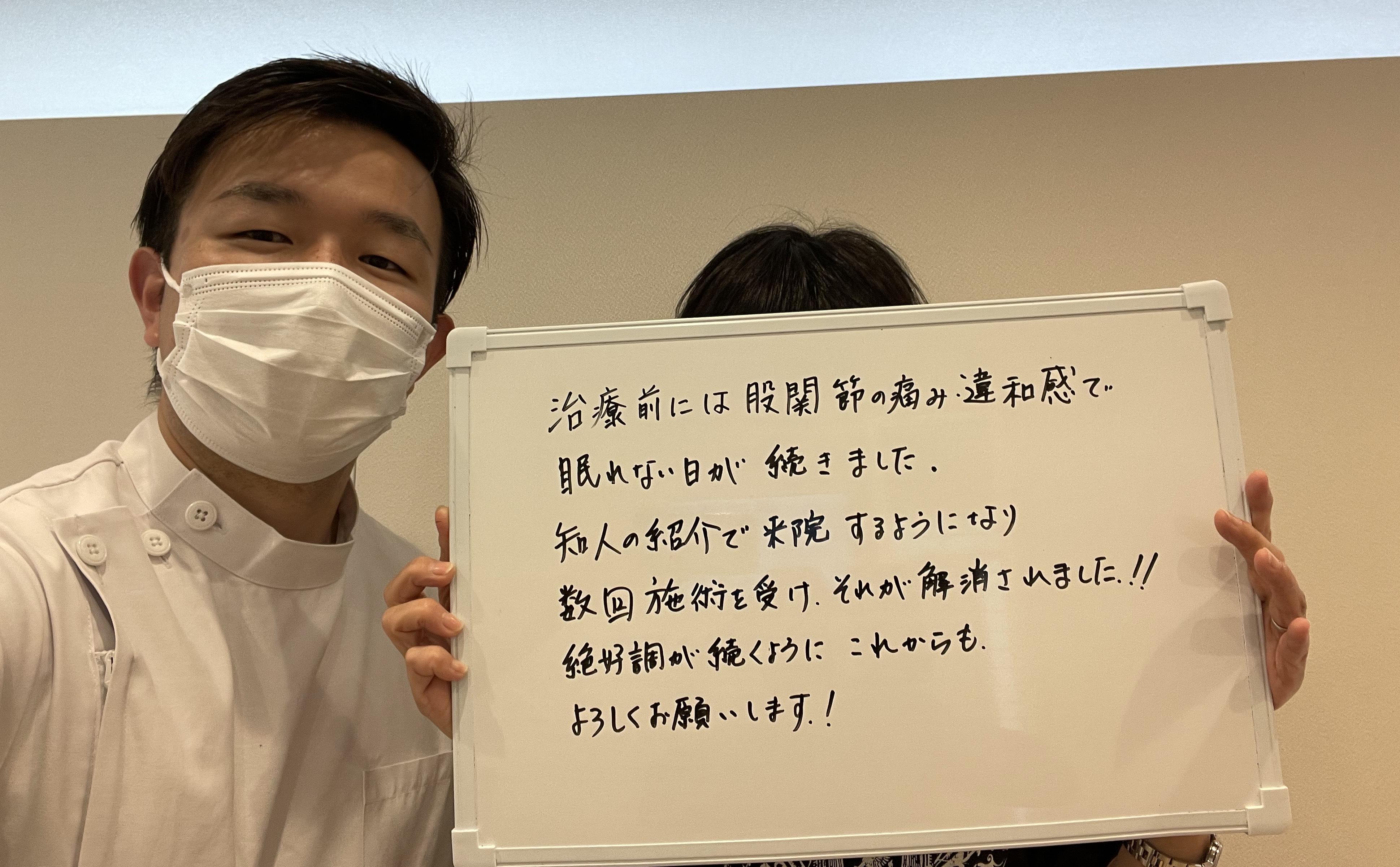 治療前に股関節の痛み・違和感で寝れない日が続きました。 (H.N様 神奈川県在住 60代女性) ※効果には個人差があります |